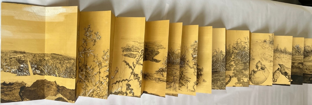 (2024, 2025) – A long etching, intended for reading. Printed on beige silk, with watercolor, in a series of 12 unique copies.